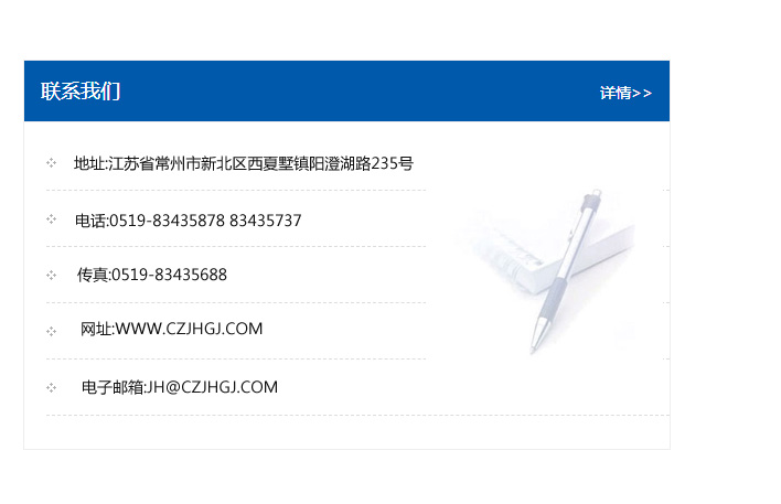 傳真:0519-83435688    郵編:213135    網址:WWW.czjhgj_com.dgll88.com    電子郵箱:JH@czjhgj_com.dgll88.com